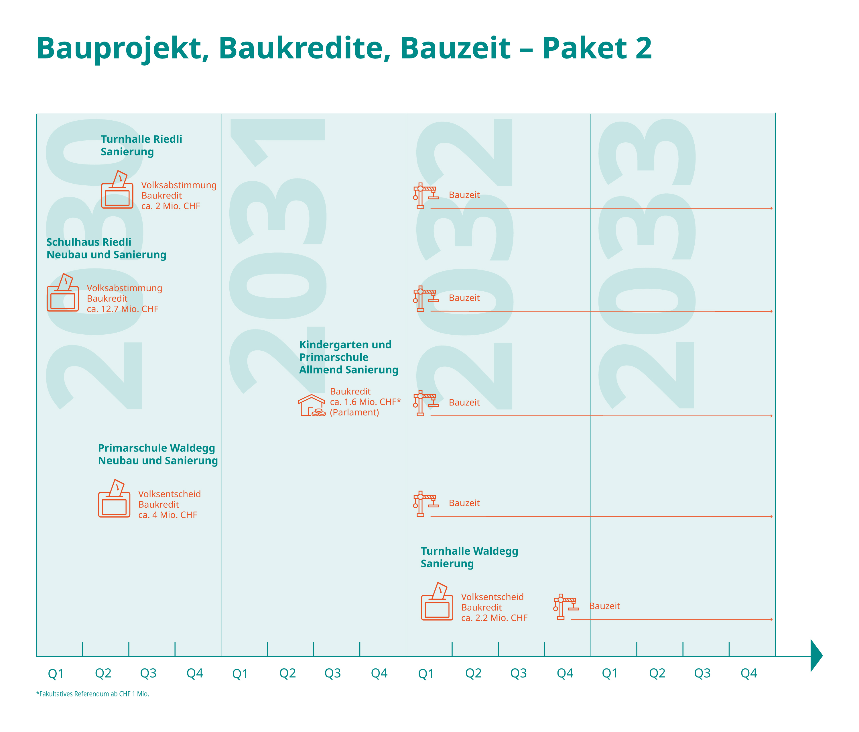 Vorgesehen sind drei Umsetzungspakete mit zeitlich gestaffeltem Baustart (siehe unten). Voraussetzung für die Sanierungen und Neubauten ist, dass die entsprechenden Baukredite die politischen Hürden nehmen. Die Kredite müssen für die einzelnen Bauvorhaben separat bewilligt werden. Zwischen 2025 und 2030 finden sechs Volksabstimmungen statt. Die restlichen Kredite liegen in der Kompetenz des Gemeinderats oder des Parlaments; in drei Fällen kann das Referendum ergriffen werden.